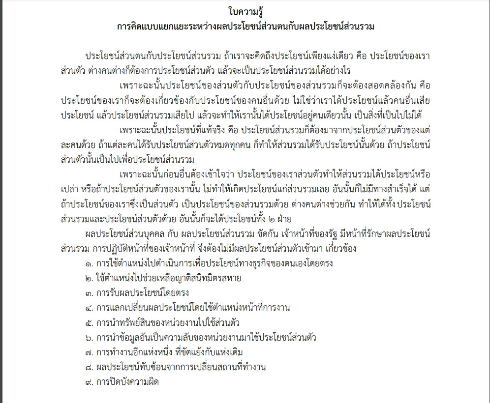 สื่อความรู้ที่ 1 เรื่อง การคิดแบบแยกแยะระหว่างผลประโยชน์ส่วนตนกับผลประโยชน์ส่วนรวม