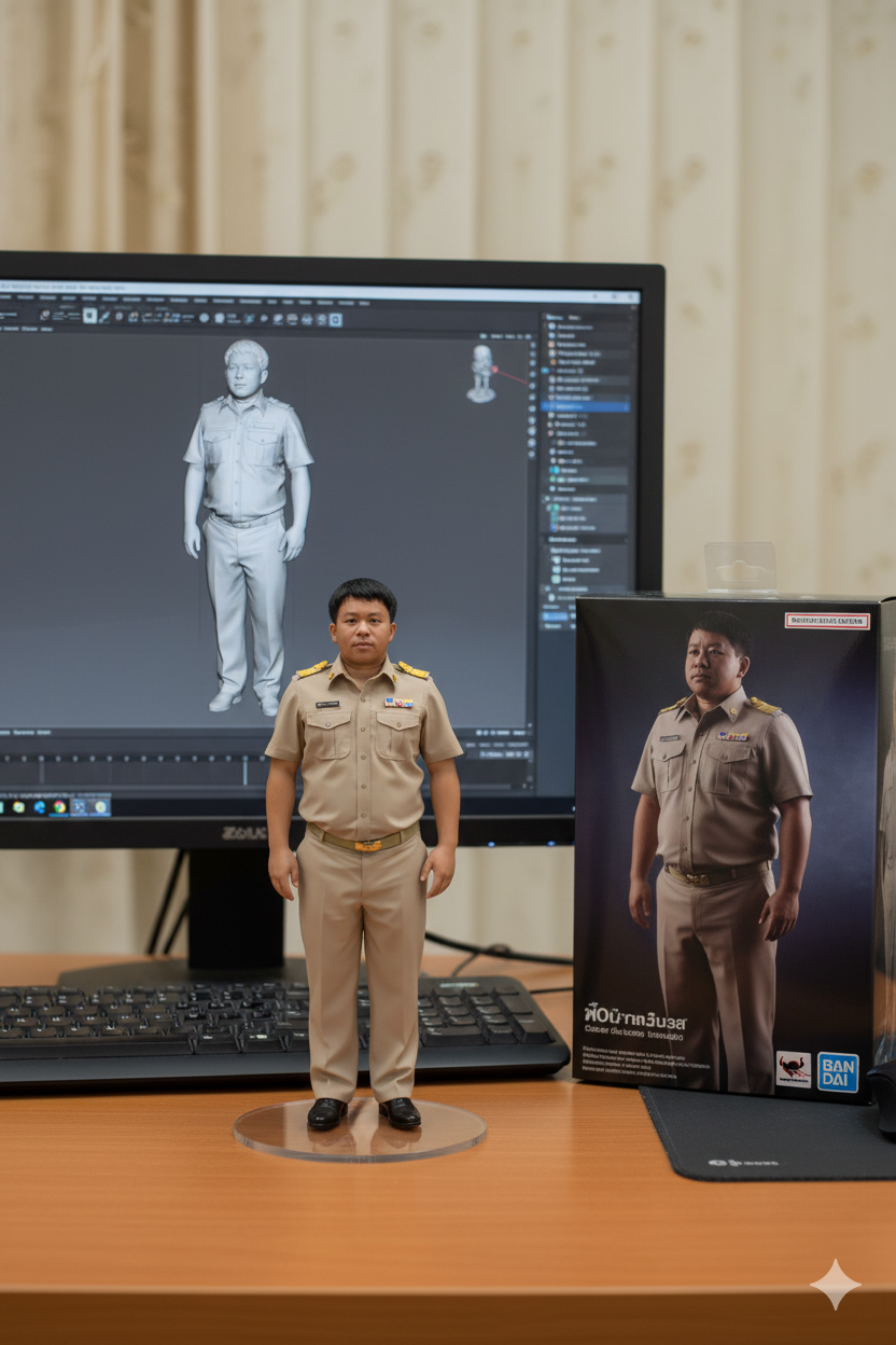"สร้างฟิกเกอร์เชิงพาณิชย์ขนาด 1/7 เฉพาะตัวละครหลักในภาพต้นฉบับ ในสไตล์ที่สมจริงและสภาพแวดล้อมที่เหมือนจริง วางฟิกเกอร์บนโต๊ะคอมพิวเตอร์ โดยใช้ฐานอะคริลิกใสทรงกลมที่ไม่มีข้อความใดๆ บนหน้าจอคอมพิวเตอร์ ให้แสดงกระบวนการปั้นโมเดล 3D ด้วย ZBrush ของฟิกเกอร์ตัวละครหลักนี้ โดยลบตัวละครอื่นๆ ทั้งหมดออกจากหน้าจอ ถัดจากหน้าจอคอมพิวเตอร์ ให้วางกล่องบรรจุภัณฑ์ของเล่นสไตล์ BANDAI ที่มีภาพพิมพ์เป็นตัวละครหลักเพียงตัวเดียวเท่านั้น"